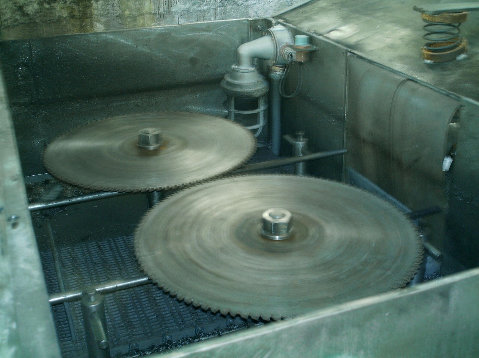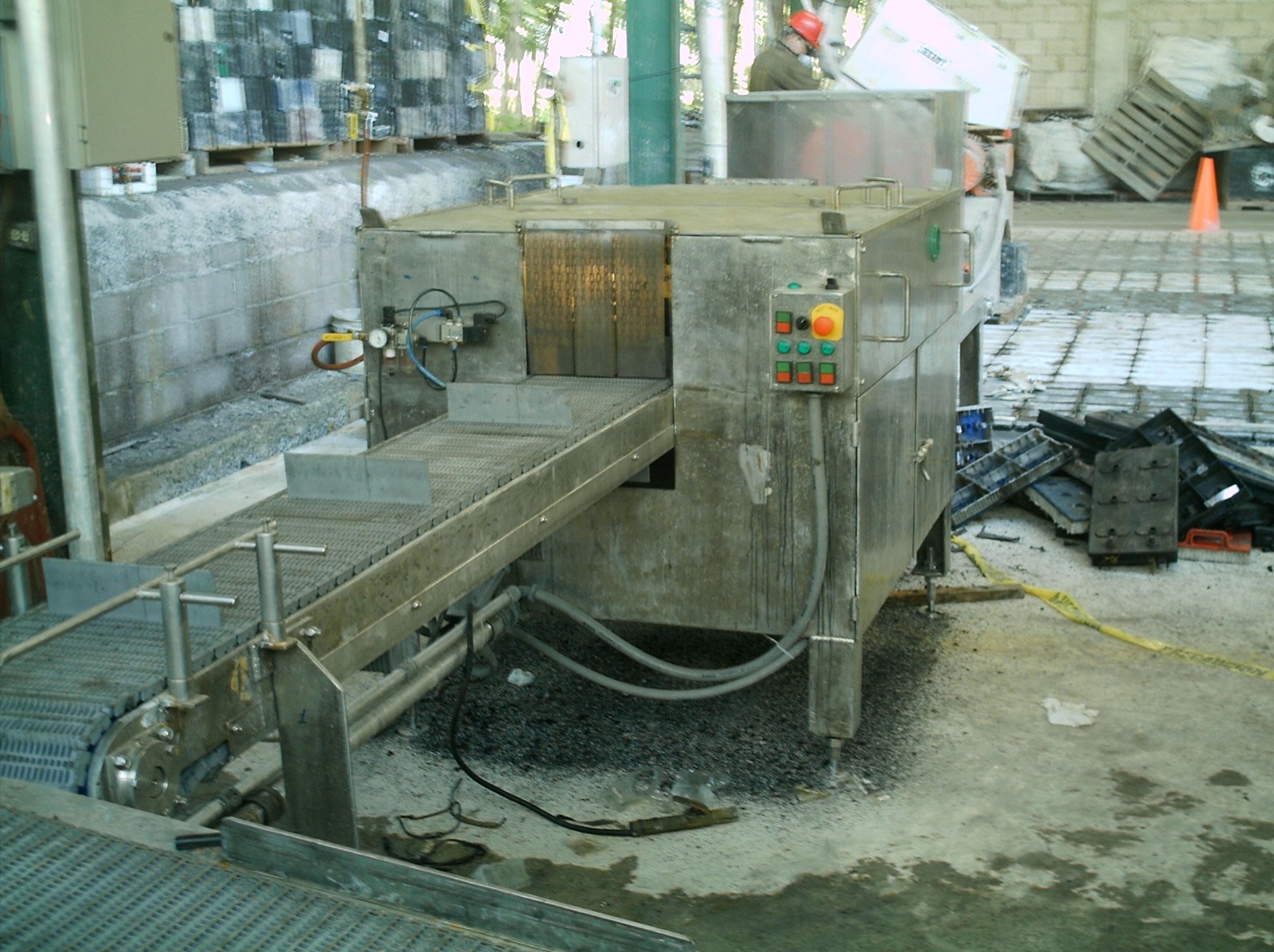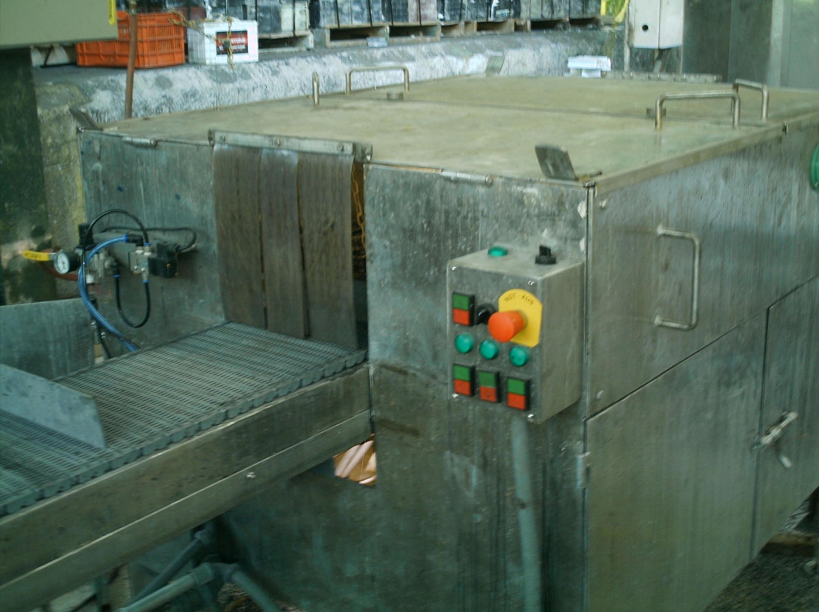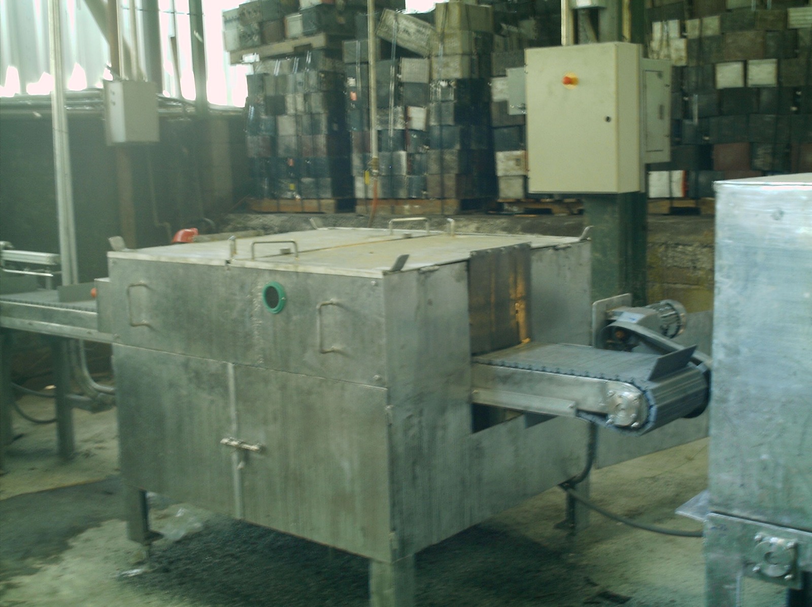 Esta máquina recicla las baterías de vehículo, les corta la tapa superior y gira la batería para sacar los núcleos de plomo para reciclarlos.
